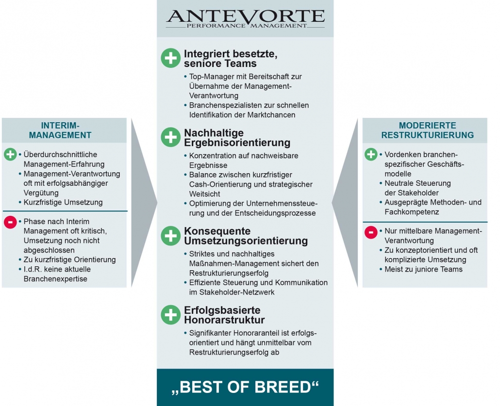 • der Vorteile etablierter Restrukturierungsberatung mit operativer Umsetzung durch integriert besetzte, erfahrene Teams und